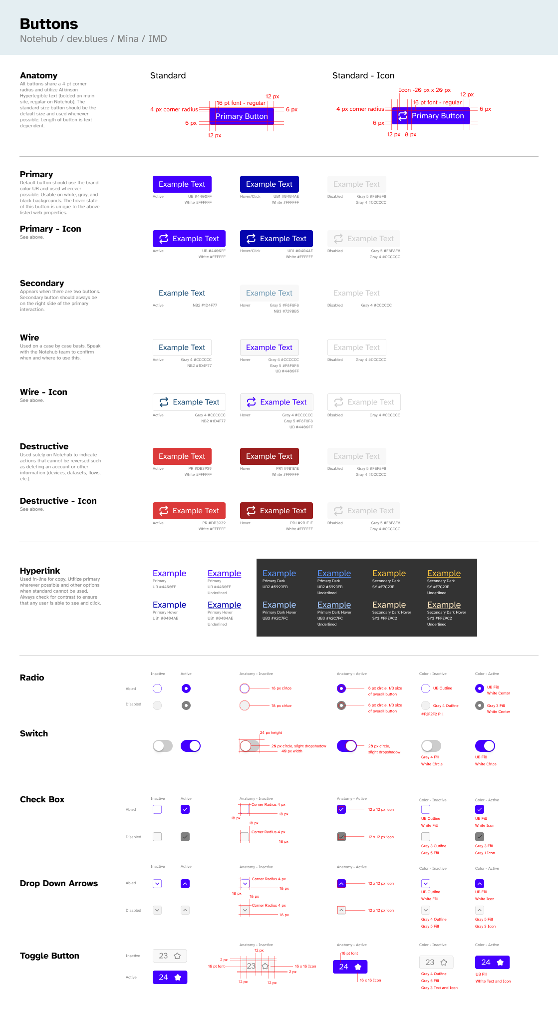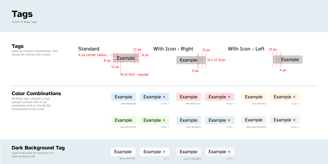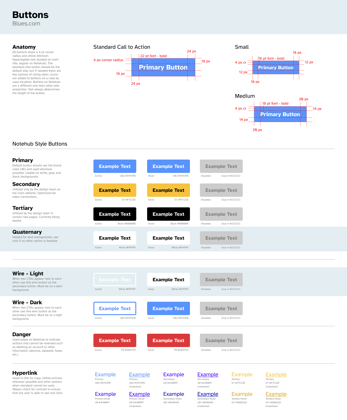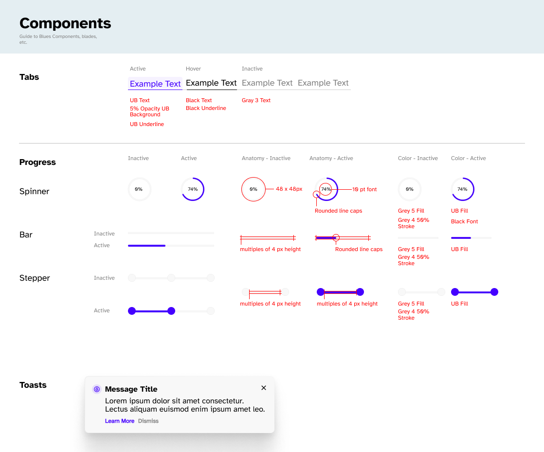 Starting with the the aforementioned button, I built out the most critical section of the guide. I began by documenting how buttons already appeared across the various products, then iterated deliberately toward what we wanted them to be. Throughout the process, I tested accessibility requirements and worked closely with the team to make informed decisions, ultimately landing on a darker blue as our primary button style.